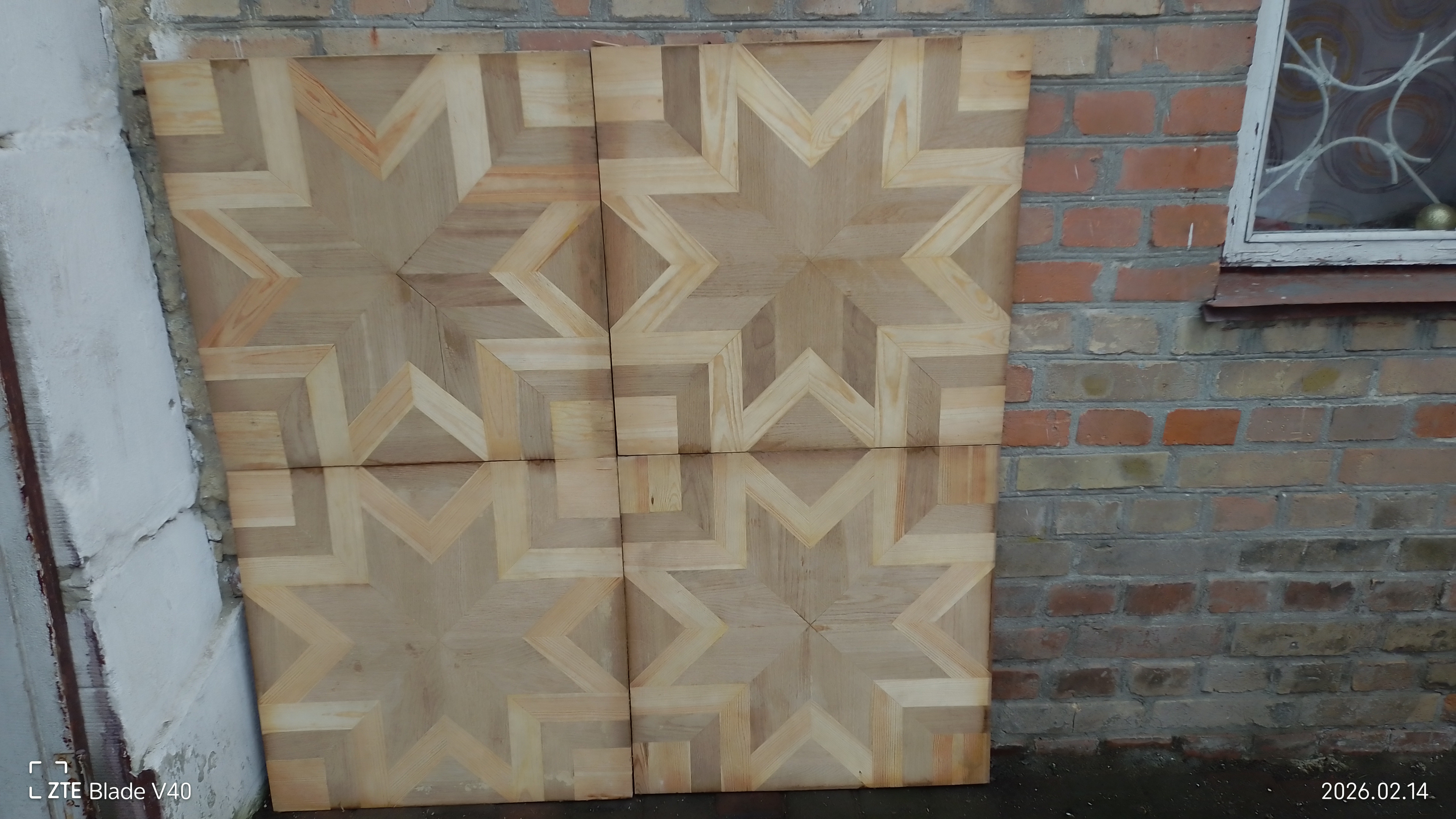 Паркет дубовий, щитовий 60×60×3см новий небув у використанні. В 1-у щиті 0, 33м2, в всього є 100 щитів це 36м2.